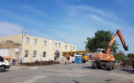 Már csak a falak állnak az egykori esztergomi vasútállomás épületének. A kivitelező szakemberei nagy intenzitással dolgoznak az állomást érintő beruházáson. - Esztergomi Napilap -